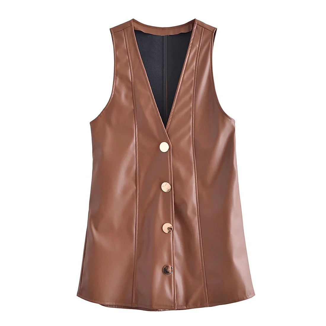 Pure Color Faux Leather Breasted Tank Top Skirt